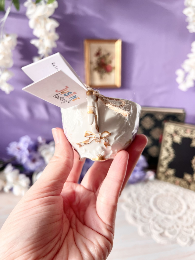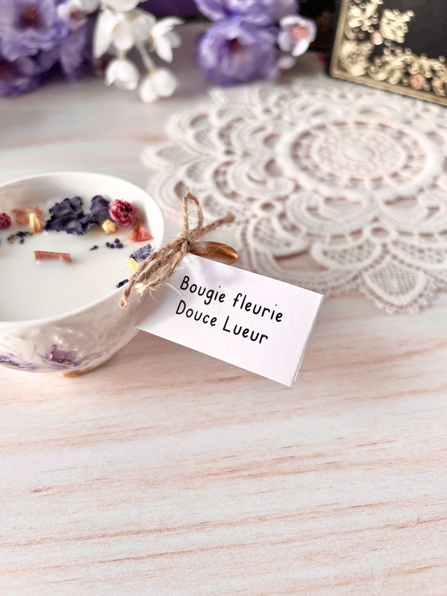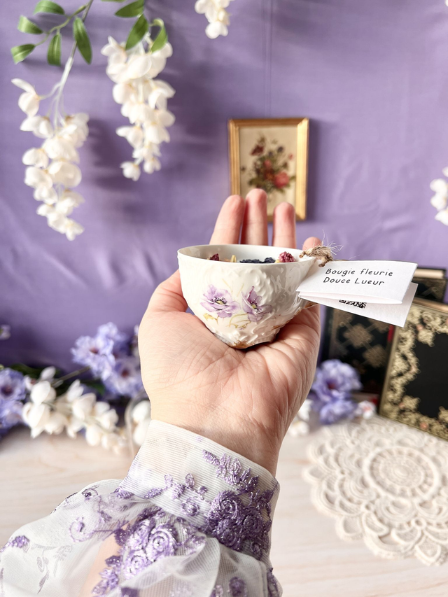 Bougie unique de la collection Romances à Mayfair (inspirée de l'univers Bridgerton), coulée dans une tasse de seconde main chiné avec amour. Cette bougie est fleurie minutieusement à la main avec de délicates petites fleurs cueillies et séchées dans mon atelier.