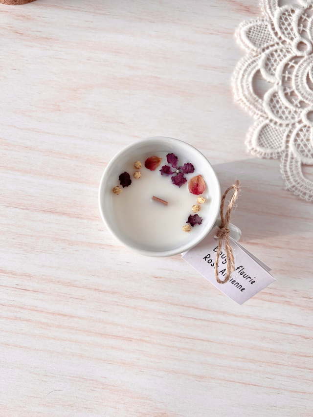 Bougie unique de la collection Romances à Mayfair (inspirée de l'univers Bridgerton), coulée dans une tasse de seconde main chiné avec amour. Cette bougie est fleurie minutieusement à la main avec de délicates petites fleurs cueillies et séchées dans mon atelier.