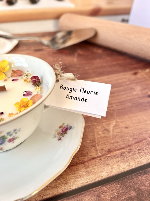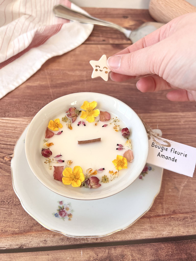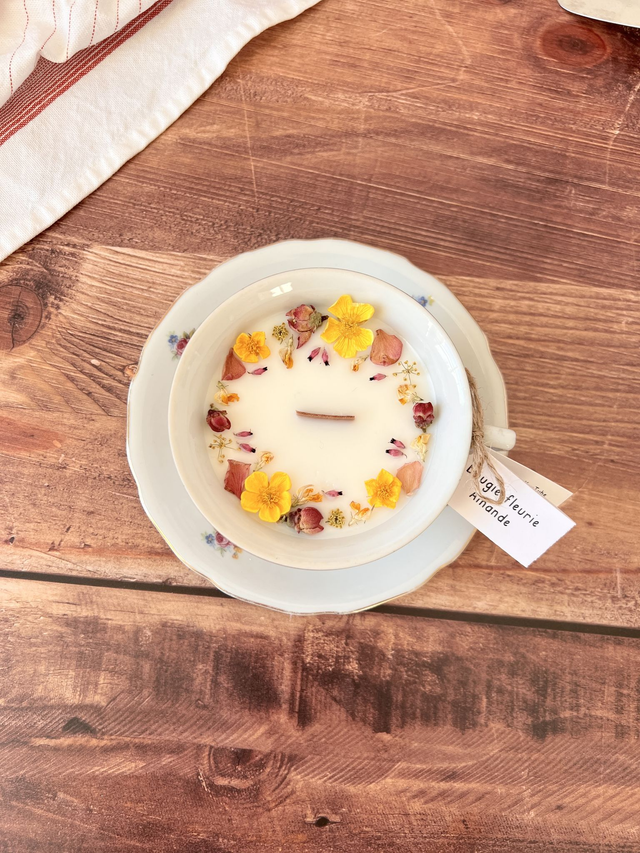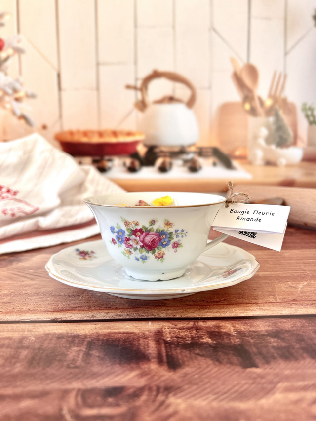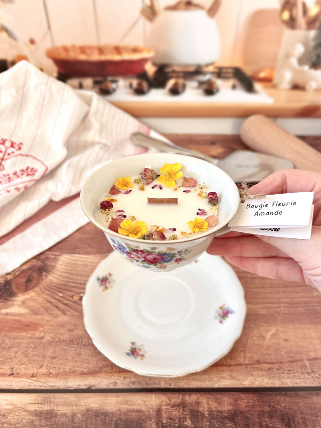 Bougie fleurie et parfumée coulée dans de la vaisselle chinée. Profite de sa senteur gourmande à l'Amande !