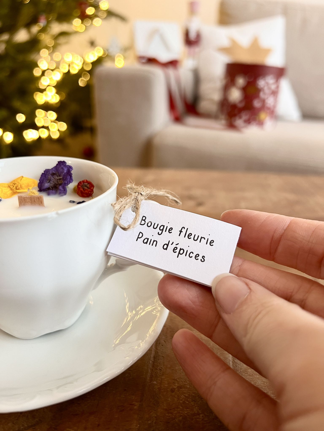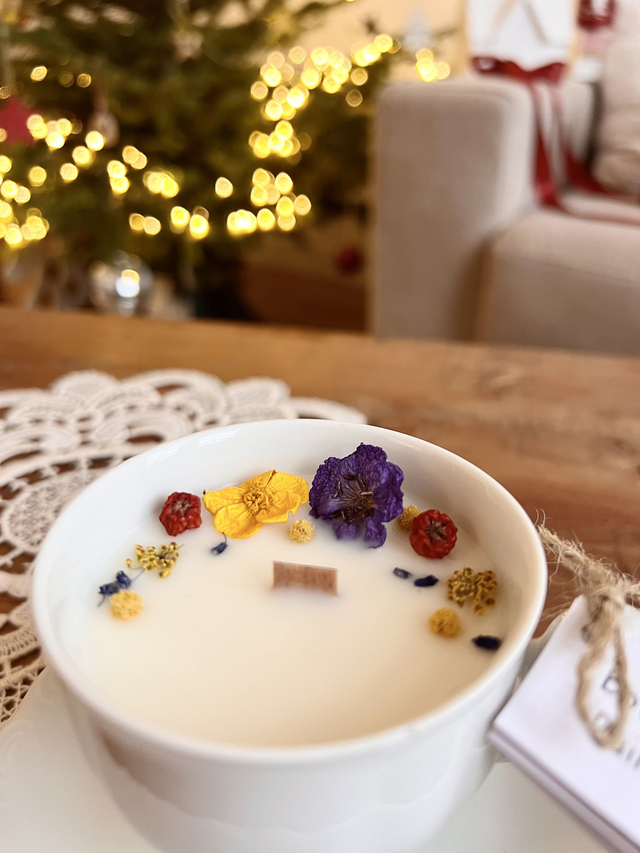 Bougie unique coulée dans une tasse de seconde main chinée avec amour. Cette bougie est fleurie minutieusement à la main avec de délicates petites fleurs cueillies et séchées dans mon atelier.